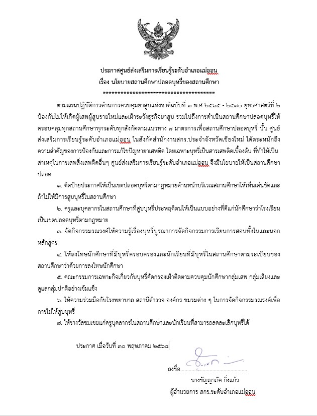 หัวข้อเรื่อง : ประกาศศูนย์ส่งเสริมการเรียนรู้ระดับอำเภอแม่ออน เรื่อง นโบายสถานศึกษาปลอดบุหรี่ของสถานศึกษา